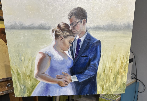Here’s how it works: I arrive early to take photographs of the key moments of your ceremony — your vows, exchanges, or any special part of the celebration — ensuring I capture the perfect scene to transform onto canvas. Then I head to the venue to set up as your guests arrive. Brush by brush, I bring that moment to life in a living artwork that unfolds in real time. Guests can enjoy watching the painting take shape, and by the end of the evening, you’ll have a beautiful, hand-painted memory of your wedding — one that tells your love story in colour, texture, and emotion. Every painting is tailored to you. You can choose the canvas size, the key moment to be painted, and whether you’d like me to finish the artwork completely onsite or add final details in my studio for a polished, gallery-ready result.