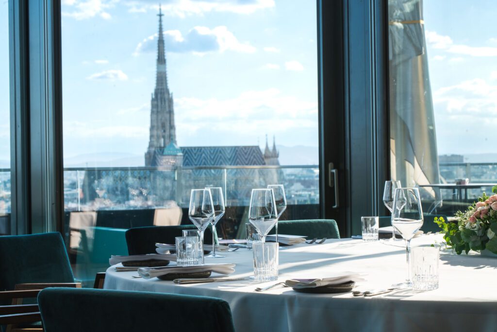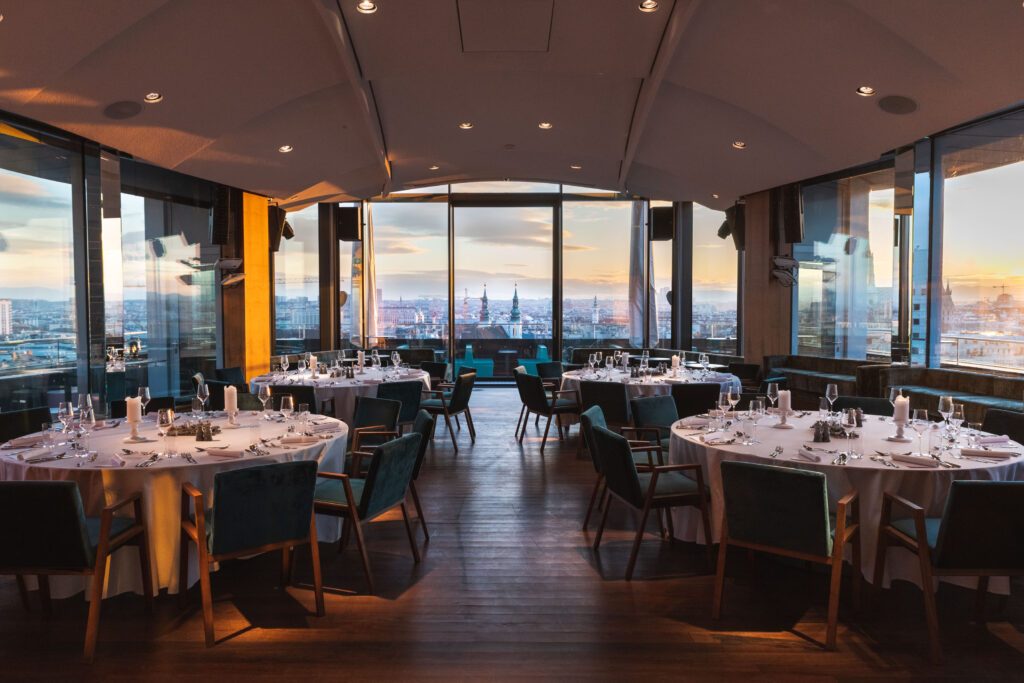 Ihr träumt von einer Hochzeitsfeier mit atemberaubendem Ausblick? Dann seid ihr im JUWEL goldrichtig. Der einmalige Weitblick über die Dächer Wiens, die zentrale Lage und das hochwertige Interieur machen die Location zum idealen Ort für eine elegante Feier.